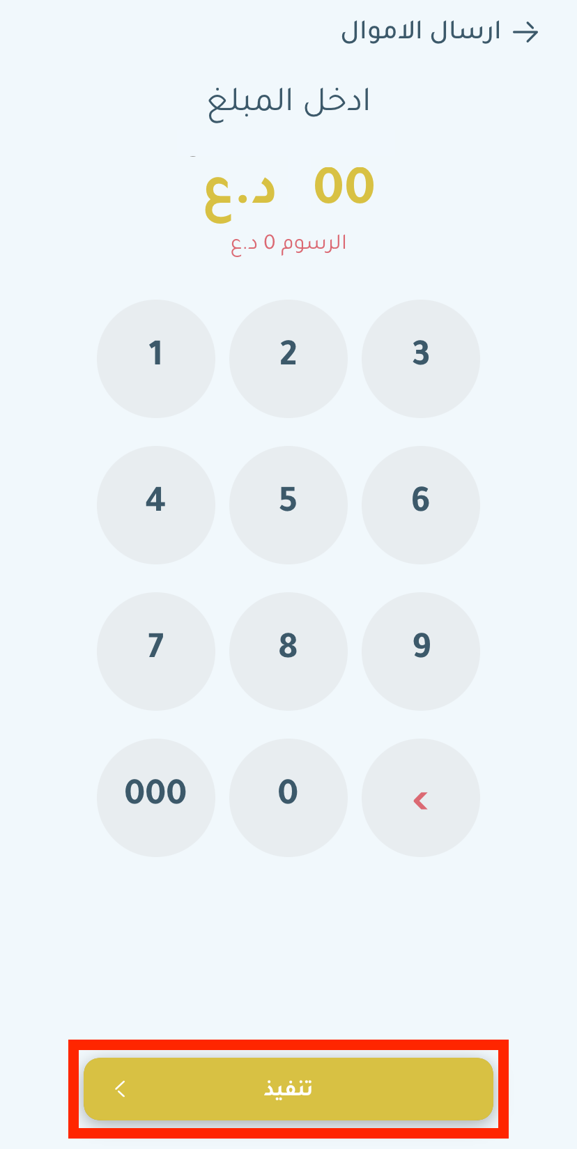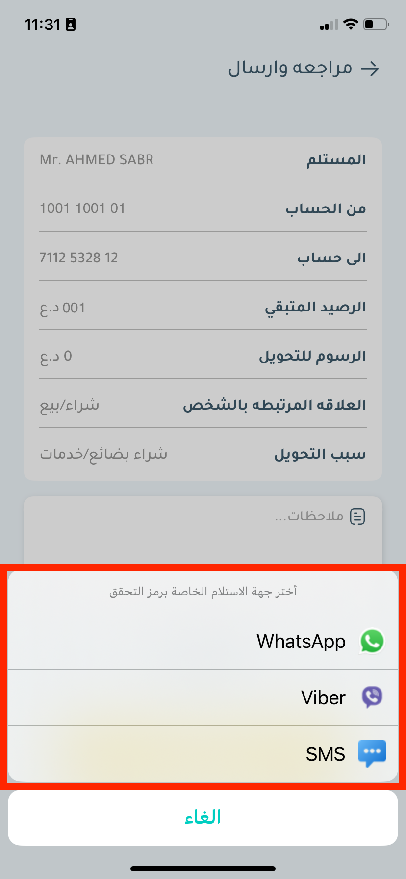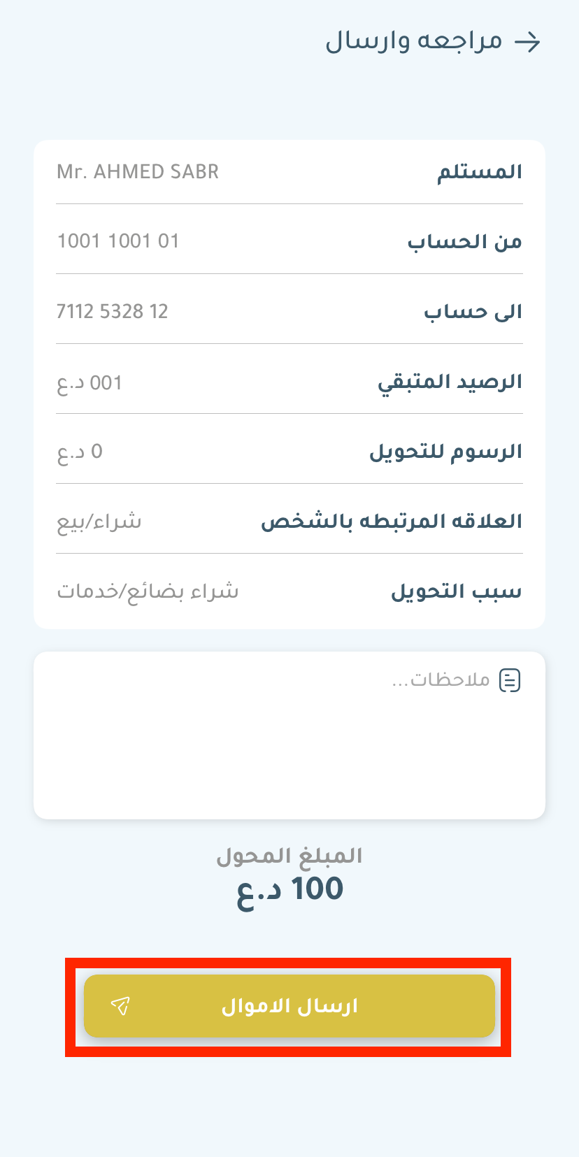 قم بتأكيد المعلومات والمبلغ، ثم اضغط على “إرسال الاموال“.